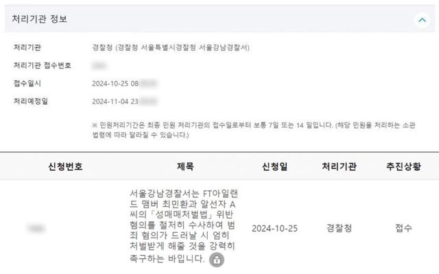A 씨가 공개한 사진에는 국민신문고를 통해 서울강남경찰서에 접수한 민원이 담겨 있다. A 씨는 최민환과 알선자 B 씨를 함께 고발했으며, 법 조항을 인용해 성매매 알선이 성립한다고 주장했다.