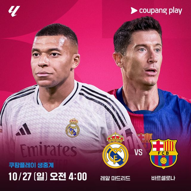 쿠팡플레이는 오는 ▲27일(일) 오전 4시 세계에서 가장 유명한 라이벌 매치인 레알 마드리드와 바르셀로나의 올 시즌 첫 ‘엘 클라시코’를 생중계한다. 이번 ‘엘 클라시코’는 리그 1위 바르셀로나와 2위 레알 마드리드 간의 치열한 순위 경쟁과 함께 ‘차세대 축구 황제’ 킬리안 음바페(레알 마드리드)와 ‘스페인 초신성’ 라민 야말(FC 바르셀로나)의 맞대결로 벌써 많은 팬들의 기대를 모으고 있다.