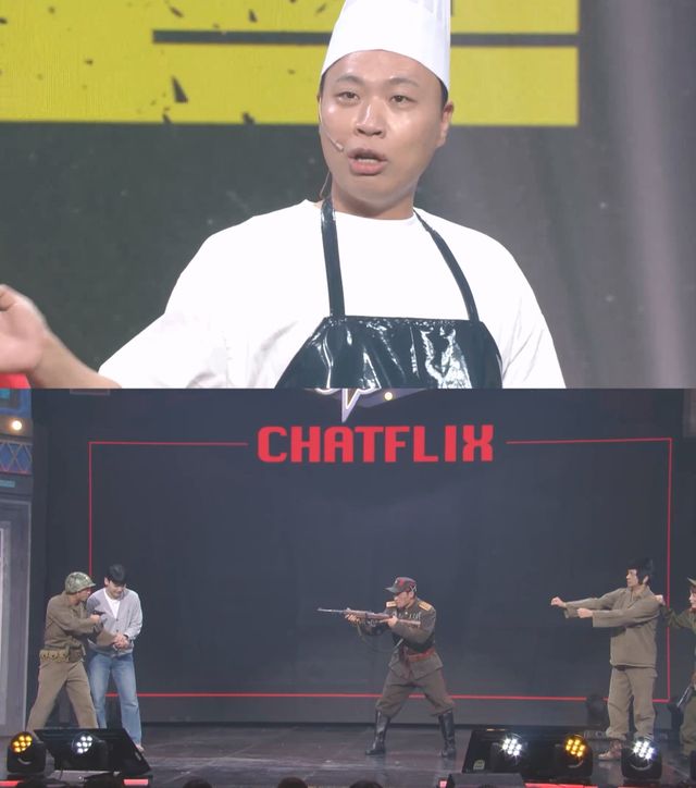 관객들과 함께 만들어가는 코너 '챗플릭스'에서는 영화 '태극기 휘날리며'를 패러디한다. '남한 특수요원' 역을 맡은 박성광은 객석에서 관객 한 명을 포로로 붙잡아 온다. 그런데 박성광이 관객을 향해 총구를 겨누고 있을 때 음악 감독의 장난으로 총성이 울려 퍼지고, 관객은 총에 맞아 쓰러지는 시늉을 한다.