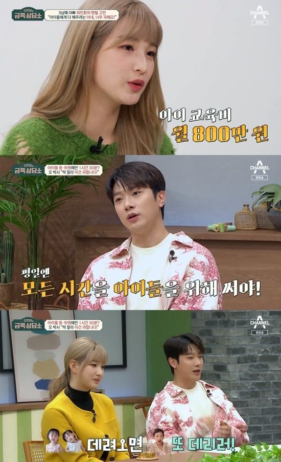 율희는 "어느 엄마나 좋은 것을 제공해 주고 싶지 않나. 아이 교육비에 한 달 기본 800만 원을 소비한다"고 고백, 최민환은 "평일에 모든 시간을 아이들을 위해 써야 한다. 하원 시간도 각각 달라 통학만 하루에 세 번이나 시켜야 한다. 아이들의 교육도 중요하지만 우리도 개인적인 시간이 필요하지 않을까"라고 불만을 말했다.