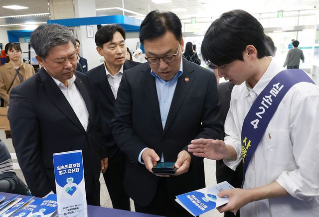 25일 실손보험 청구 전산화가 시행된 가운데 김병환 금융위원장이 홍보 부스에 방문해 현장 안내직원의 설명을 듣고 있다. ⓒ 금융위원회