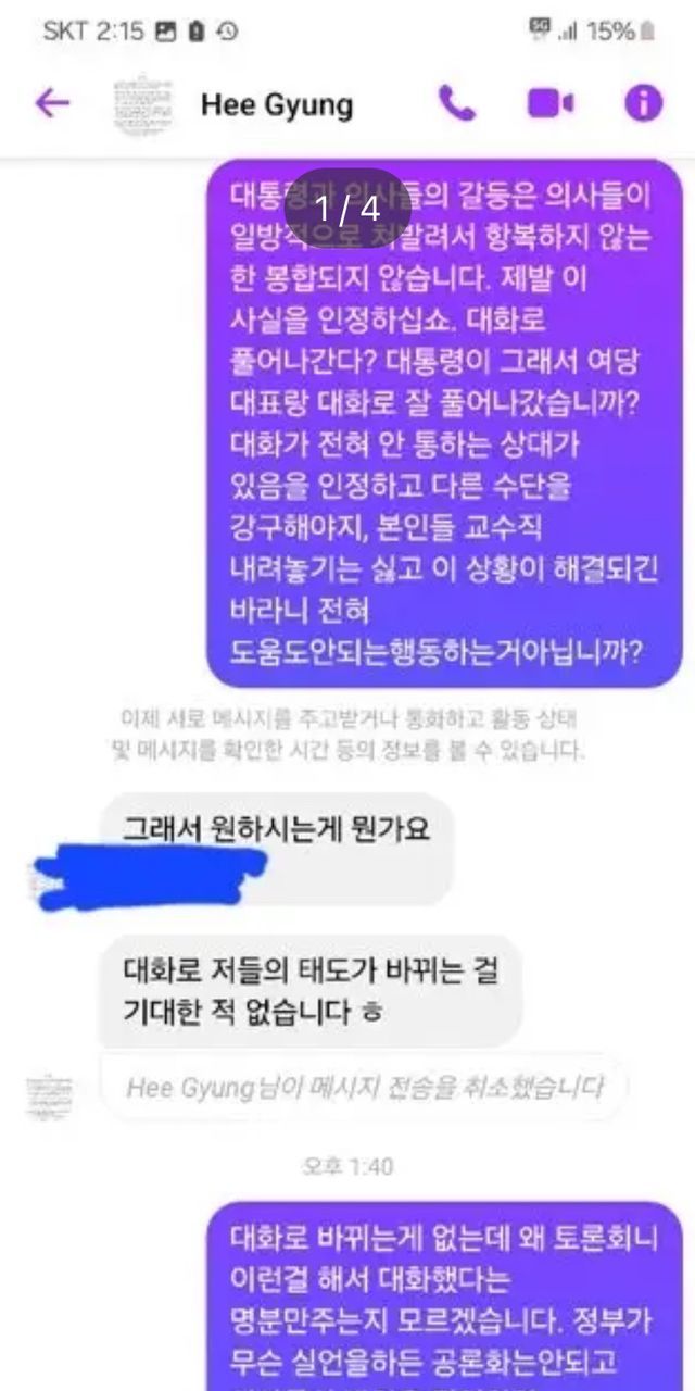 전공의주빈 한마리가 의대 교수들이 환자 죽게 안내버려두어서 정부에 처발린다고 항의성 문자 보냄