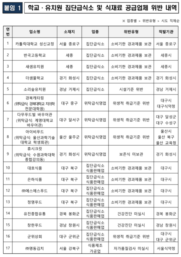 학교·유치원 집단급식소 및 식재료 공급업체 위반 내역 /식품의약품안전처