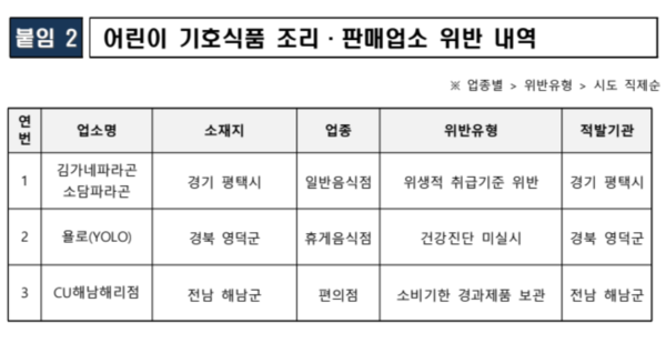 어린이 기호식품 조리·판매업소 위반 내역 /식품의약품안전처