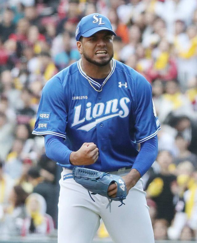 지난 19일 오후 서울 송파구 잠실야구장에서 열린 프로야구 '2024 신한 SOL 뱅크 KBO 포스트시즌' 플레이오프 4차전 삼성 라이온즈와 LG 트윈스의 경기, 6회말 1사 1,2루 상황 삼성 레예스가 LG 신민재를 병살타로 처리한 뒤 환호하고 있다. / 뉴스1