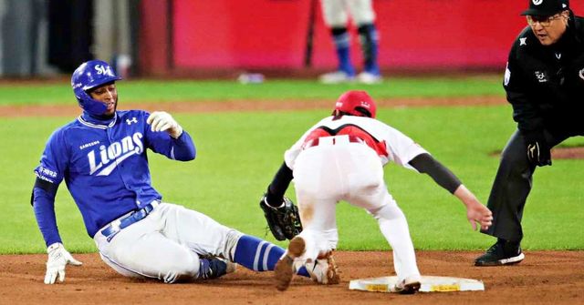 지난 23일 오후 광주 기아챔피언스필드에서 열린 프로야구 '2024 신한 SOL 뱅크 KBO 포스트시즌' 한국시리즈 2차전 삼성 라이온즈와 KIA 타이거즈의 경기, 7회초 삼성 공격에서 선두타자 디아즈가 안타성 타구를 날린 후 2루에서 기아 유격수 박찬호에게 태그아웃 당하고 있다. / 뉴스1
