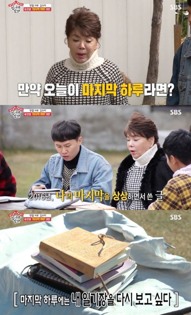 김수미는 "2년 전 동료 죽음들 많이 봤고 지난해 정말 친한 친구도 죽었다. 그런 걸 느꼈을 때 나도 확실히 죽는다는 걸 또 한 번 느낀다. 근데 내가 처녀 때 일기를 읽었다. 그때 보니까 아련히 생각나면서 '지금 알고 있는 걸 그때 알았더라면' 하고 내가 반성이 된다"라며 일기 쓰는 습관을 추천했다.