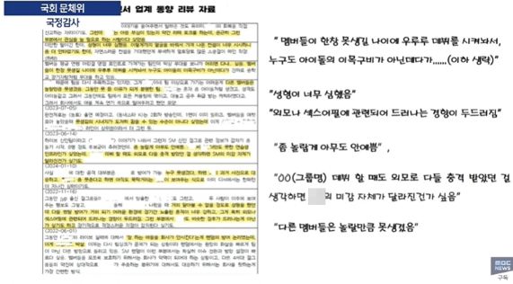 24일 진행된 국회 문화체육관광위원회 종합국정감사에서는 하이브가 작성한 타 연예기획사 미성년자 아이돌에 대한 원색적 비난이 담긴 리포트가 공개돼 충격을 안겼다.
