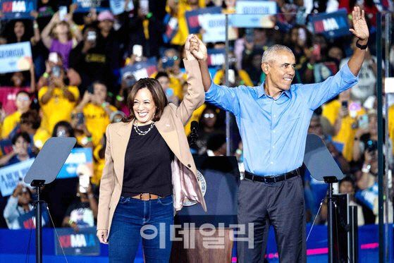 24일(현지시간) AP통신과 로이터통신 등 주요외신에 따르면 이날 해리스 부통령은 조지아 애틀랜타 외곽 클락스턴의 한 고등학교 축구장에서 열린 선거 유세 집회에서 오바마 전 대통령의 소개를 받으며 무대에 올랐다.