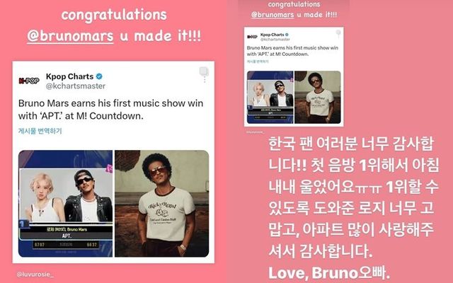 로제는 인스타그램으로 이와 관련한 보도를 공유하며 브루노 마스를 태그했습니다. "축하해. 해냈구나"라면서요. 이에 브루노 마스 역시 인스타그램에 "한국 팬 여러분 너무 감사합니다. 첫 음방 1위 해서 아침 내내 울었어요"라는 글을 올렸어요. 한글로 말이죠.