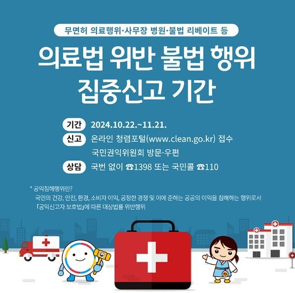 [와이뉴스] 무면허 의료행위·사무장 병원·불법 리베이트 등 의료법 위반 불법 행위 집중신고 기간(10.22.~11.21.) 운영합니다.