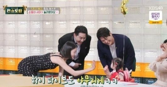엄마의 부름에 딸 서아가 등장했고, 서아는 5주년 기념 풍선을 들고 등장해 귀여움을 자아냈다. 출연진들은 "실물 영접"이라며 감탄했고, 서아는 "축하합니다"라며 하트 애교까지 보였다.