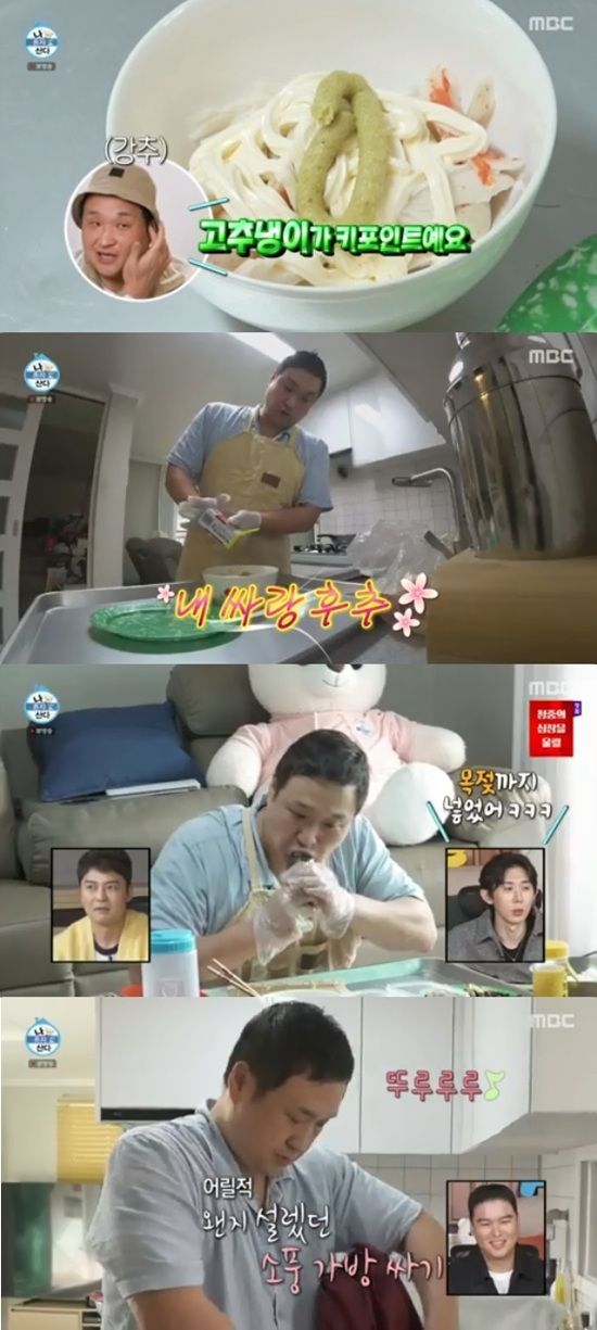 구성환은 마요네즈, 게맛살, 고추냉이, 후추 등을 넣어 마요 고추냉이 게맛살을 만들고 어묵과 계란 지단 등 기본 속 재료들을 준비했다.