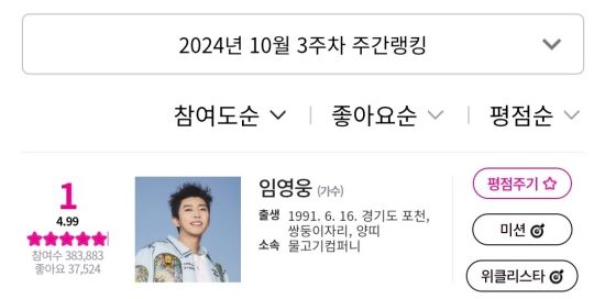 아이돌차트에 따르면 지난 10월 18일부터 10월 24일까지 집계된 평점랭킹에서 임영웅은 38만 3,883표를 얻어 최다득표를 기록했다.