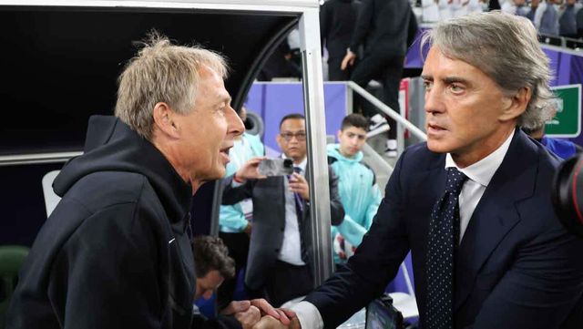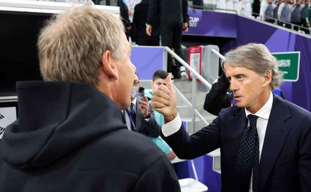 위르겐 클린스만 감독과 로베르토 만치니 사우디아라비아 감독이 30일(현지시간) 카타르 알라이얀 에듀케이션 시티 스타디움에서 열린 2023 아시아축구연맹(AFC) 카타르 아시안컵 16강전 대한민국과 사우디아라비아의 경기에 앞서 인사를 나누고 있다. / 뉴스1