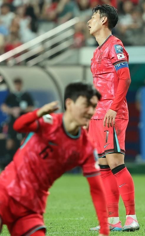 지난달 서울 마포구 서울월드컵경기장에서 열린 2026 국제축구연맹(FIFA) 북중미 월드컵 아시아 3차 예선 B조 1차전 대한민국과 팔레스타인의 경기, 대한민국 손흥민이 공격에 실패하자 아쉬워하고 있다 / 뉴스1