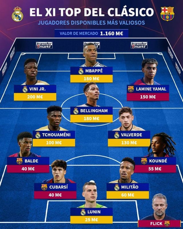 한 축구 통계 매체가 스페인 라리가 레알 마드리드와 바르셀로나 선수들로만 구성한 시장 가치 베스트11을 공개해 팬들의 눈길을 끌었다. 특히 이 명단은 오는 주말 출전 가능한 선수들로만 꾸려졌다.