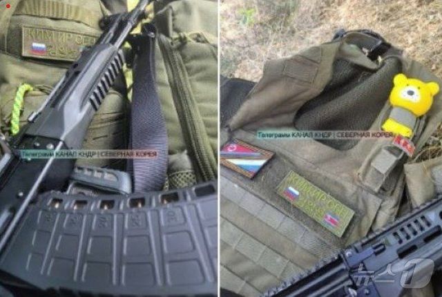 사진 속 방탄복에는 러시아 국기와 북한 인공기가 반씩 그려진 표식이 부착돼 있고, 한글로 ‘김일성’이라고 적힌 이름표가 붙어있다. 소총도 보인다.