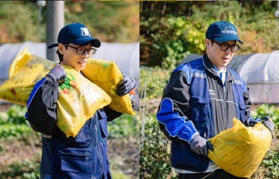 공개된 사진 속 일복이 터진 유재석과 하하의 모습이 담겨 있다. 마을 이장님의 부탁으로 비료 포대 배달도 하게 된 것이다. 두 사람은 으쌰으쌰 무거운 비료 포대를 트럭에 싣고 있다.