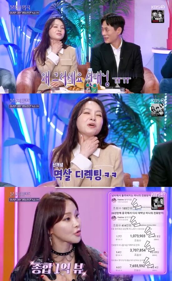 한편 이날 미나는 본인의 히트곡 '전화받어'가 MZ 사이에 유행하면서 관련 영상 조회수가 총합 1억이 넘었다고 밝혀 놀라움을 자아냈다.
