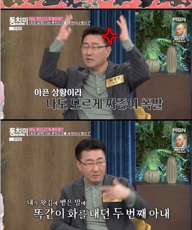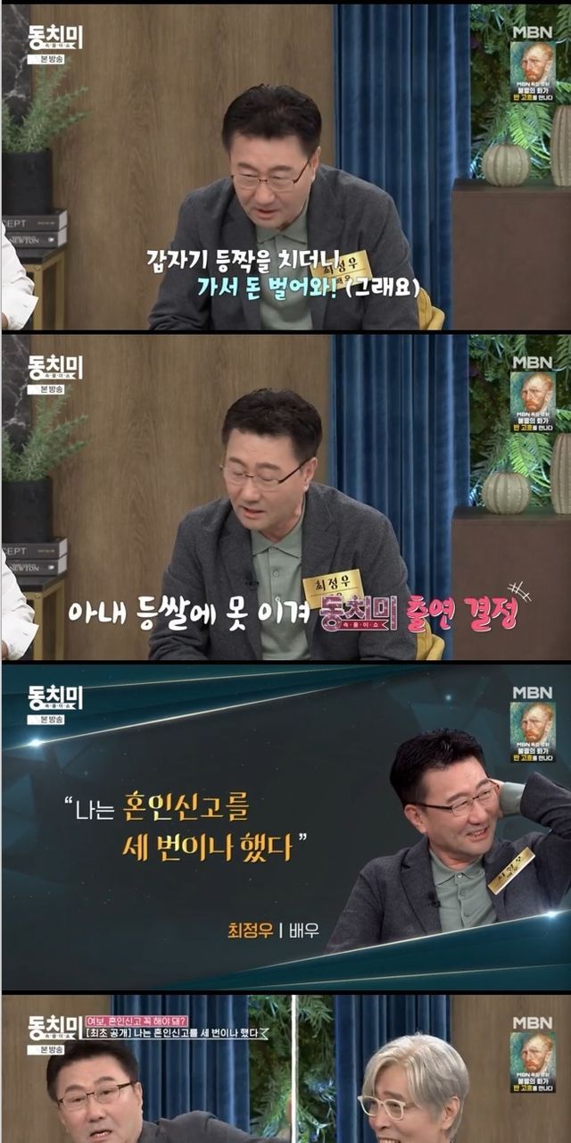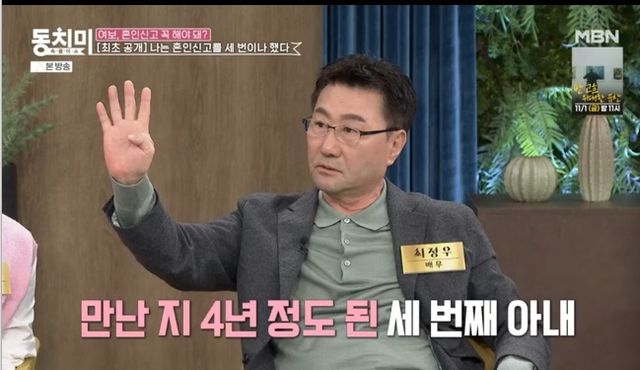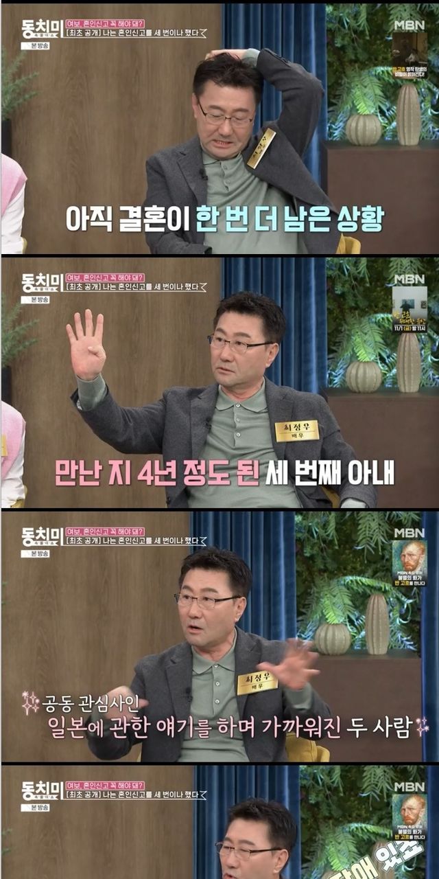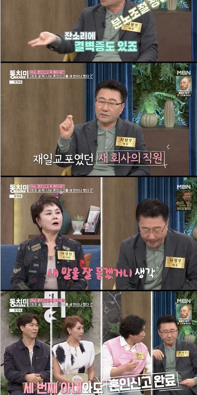 그는 "지금 아내가 만난 여인 중에 최강의 마누라다. 갑자기 등짝을 때리더나 '동치미'에서 돈을 벌어오라고 하더라. 그래서 출연하게 됐다. 내 일을 털기가 사실 부끄럽지 않냐. 공과 사가 있는데 사가 그렇게 자랑할 만한 사가 아니다"라며 혼인신고를 세 번 했다고 소개됐다.