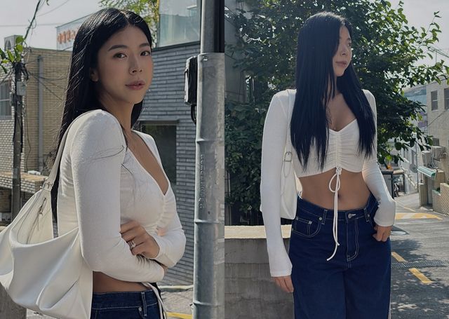 제이제이는 청바지에 화이트 티셔츠를 입은 모습이다. 뱃살 역대 최고라고 했지만, 줄로 고정한 티셔츠는 제이제이의 완벽한 S라인을 부각시키며 아름다움에 감탄을 더한다.
