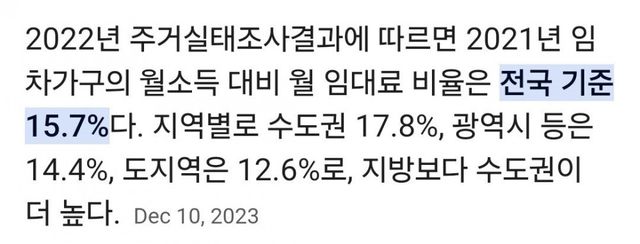 [ 한국 월세는 소득 대비 15.7%에 수도권조차 17.8% ]