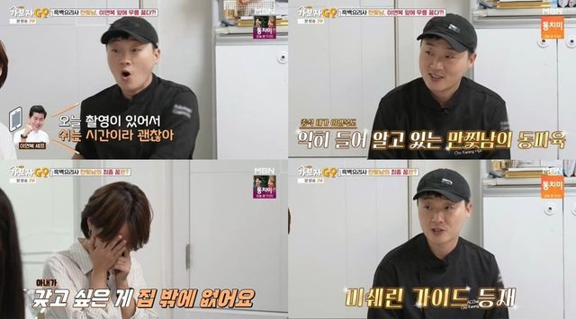 요리를 맛본 뒤 조광효 셰프의 집으로 간 MC들은 조광효 셰프와 아내가 어떻게 만나게 됐는지 물었다. 조광효 셰프는 “친구에게 가인 닮은 사람을 소개시켜달라고 해서 아내의 사진을 받았는데 너무 예뻤다. 그래서 그 사진을 관물대에 붙여놓고 ‘제대하면 사귈 거다’라고 다짐했다. 이후 친구와 아내가 있던 자리에 가서 처음 만났는데 실물도 예뻤다”라며 첫눈에 반했던 이야기를 전했다.