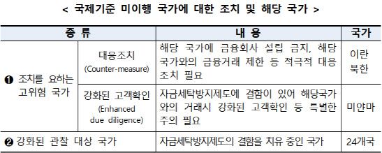 국제 기준 미이행국인 북한, 이란, 미얀에 대해선 중대한 결함으로 조치를 요하는 ‘고위험 국가’ 지위를 유지했다. 다만 미얀마에 대해서 일부 기준 이행 성과를 인정하면서도 차기 총회까지 추가 성과를 입증하지 못할 경우 대응 조치 부과 가능성을 고려할 것이라고 경고했다.