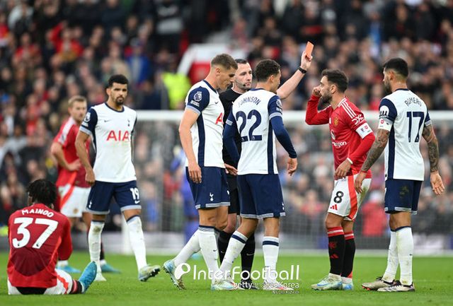 토트넘전 맨유는 퇴장 악재를 겪었다. 전반 42분 페르난데스가 제임스 매디슨에 가한 태클이 위험했다는 이유로 다이렉트 퇴장을 받았다. 이후 수적 열세에 놓인 맨유는 두 골을 더 허용하여 0-3으로 패배했다.