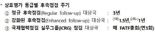 FATF는 국제사회가 자금 세탁·테러 자금 조달에 공동 대응하기 위한 국제기준을 마련하고 정기적으로 각국의 이행 수준을 상호 평가하고 있다. 상호 평가 등급은 △정규 후속 점검 △강화된 후속 점검 △제재 대상 국가로 분류된다.