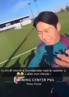 프랑스 메이드인풋은 26일 "'컴 온 차이니스!' PSG 서포터가 이강인 앞에서 인종차별 발언을 했다. 지난 금요일 SNS에 게재된 영상에는 한 PSG 팬이 이강인에게 'Allez mon Chinois'라고 말하는 모습이 담겨 있다"고 전했다.