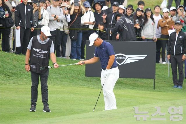 (인천=뉴스영 김영식 기자) 김주형(22, 나이키)이 27일 제네시스 챔피언십 4라운드 1번 홀(파4) 그린옆에서 어프로치 할 클럽을 선택하고 있다.