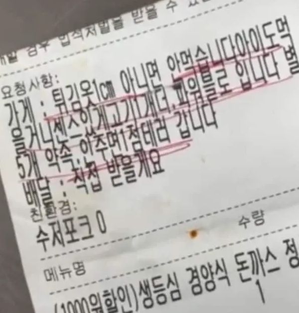 손님은 주문서에 "튀김옷 1㎝ 아니면 안 먹습니다. 아이도 먹을 거니 센스 있게 고기 1개 더. 파워블로거입니다. 별 5개 약속. 안 주면 1점 테러 갑니다"라는 메시지를 남겼다.