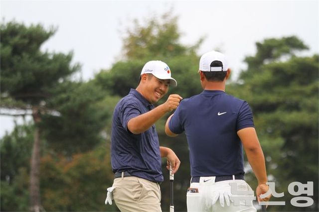 (인천=뉴스영 김영식 기자) 안병훈(33, CJ)이 27일 제네시스 챔피언십 4라운드가 열리는 2번 홀(파4) 그린에서 김주형(22, 나이키)과 파 퍼트를 성공시키며 기뻐하고 있다. 안병훈은 티샷이 러프에 빠지며 1벌타를 받았지만 중거리 퍼트를 성공시키며 타수를 잃지 않고 파를 지켜냈다.