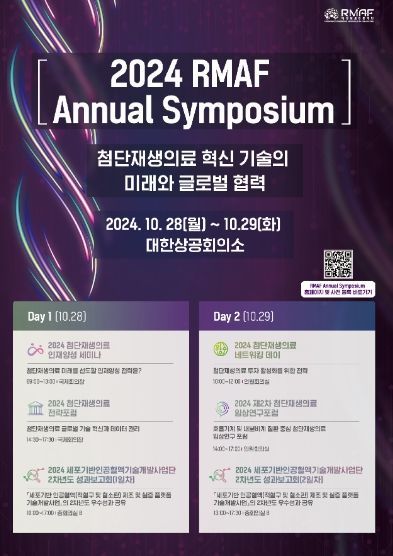 [와이뉴스] 보건복지부와 재생의료진흥재단은 10월 28일과 10월 29일 양일간 대한상공회의소에서 ‘첨단재생의료 혁신 기술의 미래와 글로벌 협력’을 주제로 첨단재생의료 통합 심포지엄(2024 RMAF Annual Symposium)을 개최한다고 밝혔다.