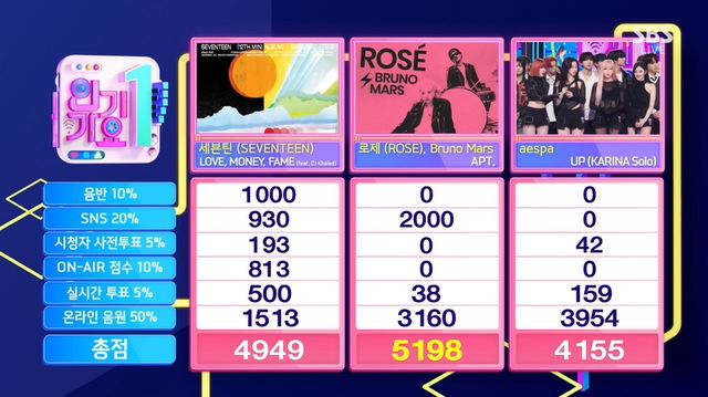이로써 로제와 브루노 마스는 지난 24일 방송된 Mnet '엠카운트다운'에 이어 두 번째로 음악방송 1위를 거머쥐었다.