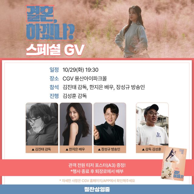 그런 ‘결혼, 하겠나?’가 오는 29일 오후 7시 30분 CGV용산아이파크몰에서 스페셜 GV를 갖는다. 이날 행사에는 영화 ‘창궐’, ‘공조’, ‘수사반장1958’ 등 연출을 맡은 김성훈 감독이 모더레이터로 진행을 맡으며 ‘결혼, 하겠나?’ 김진태 감독, 우정 역의 배우 한지은, 그리고 다양한 예능과 유튜브에서 대활약 중인 장성규가 특별 게스트로 참석해 자리를 빛낼 예정이다. 장성규의 재치 있는 입담으로 영화 속 선우의 녹록치 않은 현실과 우정과 선우의 단단한 사랑 등 다채로운 이야기를 유쾌하게 풀어나가며 색다른 GV 시간을 만들어 나갈 예정이다.