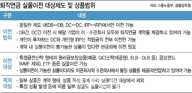 전문가들은 퇴직연금 갈아타기 시행 이전 자신의 포트폴리오에서 옮길 수 있는 상품이 뭔지 파악해야 한다고 조언했다. 예금, 채권, 원리금보장 파생결합사채, 펀드(MMF 제외), ETF는 계좌 이전을 할 수 있다. 주식, 리츠, 주가연계증권(ELS), 금리연동형 보험, 디폴트 옵션 등은 실물이전이 불가능하다.