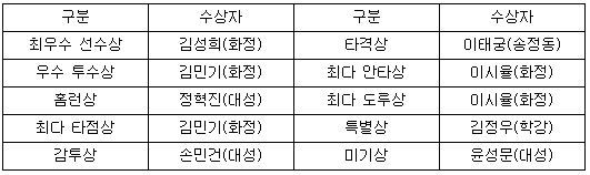 이와 함께 이번 대회 최우수선수로 선정된 화정초 김성희군에게는 트로피와 상장이 주어졌으며, 각 부문별 수상자에게도 트로피와 다양한 야구용품이 부상으로 주어졌다.