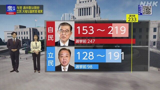일본 언론들은 여당이 승패의 마지노선인 ‘자민-공명’ 과반(233석)을 밑돌 가능성이 큰 것으로 보고 당내 이시바 책임론이 커질 것으로 전망하고 있다.