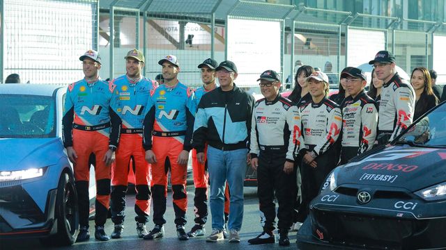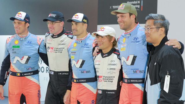 현대차와 토요타 WRC 소속 드라이버들이 기념 사진을 찍고 있다. 왼쪽부터 티에리 누빌, 야리 마티 라트발라, 다니 소르도, 카츠타 타카모토, 안드레아스 미켈센, 장지하 현대 드라이빙익스피리언스&모터스포츠팀 팀장. / 권혁재 PD