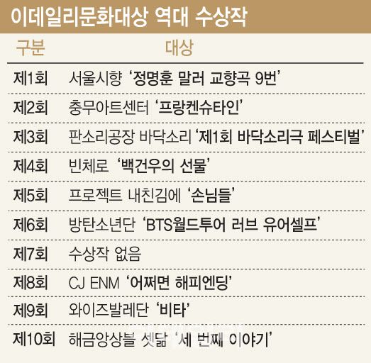 제8회 대상은 CJ ENM의 창작뮤지컬 ‘어쩌면 해피엔딩’에 돌아갔다. 짜임새 있는 스토리와 공감 가는 메시지, 귀에 감기는 넘버(노래)로 한국 창작뮤지컬의 수준을 한 단계 끌어올렸다는 평가를 끌어냈다. 9회 대상은 와이즈발레단의 창작발레 ‘비타’(VITA)가 받았다. 한국 컨템포러리 발레가 나아가야 할 방향을 제시한 작품으로 호평받았다. 지난해 10회에는 해금앙상블 셋닮 ‘세 번째 이야기’가 영광의 대상을 수상했다. 세 명의 중견 해금 연주자로 2018년 창단한 셋닮은 국악 앙상블이라는 새로운 판을 확장했다는 평가를 받았다.