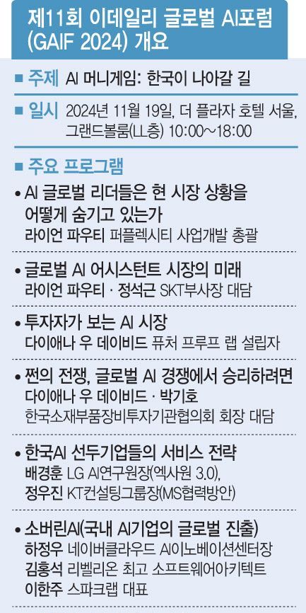 오후에는 배경훈 LG(003550) AI 연구원장이 자체 개발 파운데이션 모델인 ‘엑사원 3.0’을 소개하면서 LG그룹 내 적용 상황과 오픈소스 생태계 활성화 전략을 발표하고, 정우진 KT(030200) 컨설팅 그룹장이 연사로 참석해 총 2.4조원 규모로 체결된 KT와 마이크로소프트(MS)의 AI·클라우드 협력 방안을 구체적으로 발표한다.