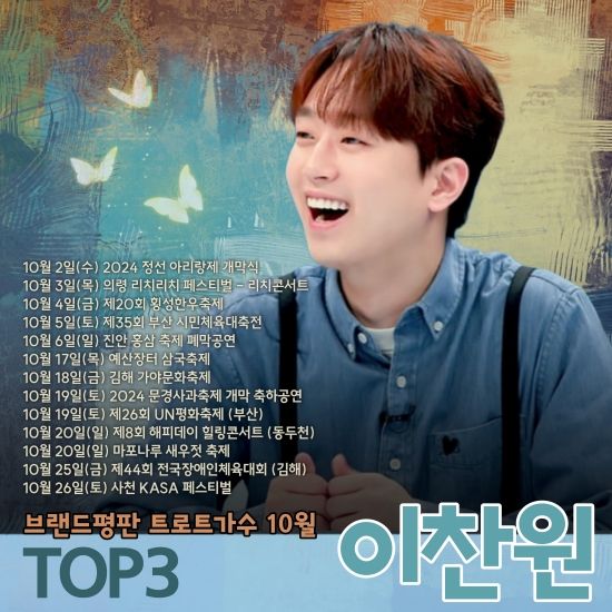축제의 계절인 가을인 만큼, 이찬원이 지역 축제에서 보인 활약도 괄목할만했다. 그는 강원도, 경상도, 전라도, 충청도, 경기도, 서울을 종횡무진 오가며 행사에 맞는 맞춤형 멘트와 무대로 축제의 품격을 더했다. 특히 이찬원은 특유의 가창력과 친화력이 어우러진 시그니처 무반주 무대로 지역민들의 환호를 받기도 했다.
