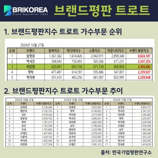 (엑스포츠뉴스 이정범 기자) 이찬원이 한국기업평판연구소의 10월 트로트 가수 브랜드평판 분석에서 3위를 차지했다.