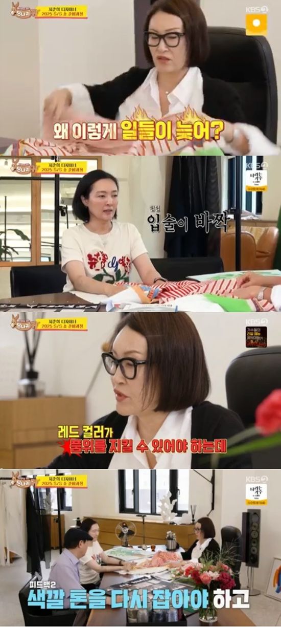 지춘희는 "레드 컬러가 품위 지킬 수 있어야 하는데 이게 너무 밝다", "연두도 한 톤 낮아야 한다" 등 수정사항을 쏟아냈다.