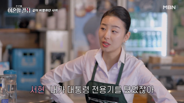 친구가 “결혼하고 아이 때문에 회사 그만두지 않았나”라고 묻자 명서현은 “아이 때문은 아니고 남편 때문에 그만 뒀다”고 말했다. 그는 “미련이 많이 남았다”며 “내가 대통령 전용기를 탔었지 않나. 결혼하고, 바로 허니문 베이비가 생긴 거다”라고 덧붙였다.