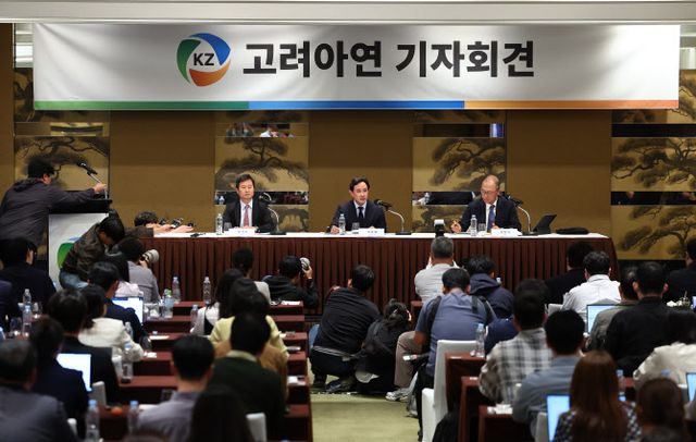 MBK파트너스·영풍과 경영권 분쟁을 벌이고 있는 고려아연의 최윤범 회장이 2일 오후 서울 용산구 그랜드하얏트 호텔에서 열린 고려아연 기자회견에 참석하고 있다. (사진=연합뉴스)