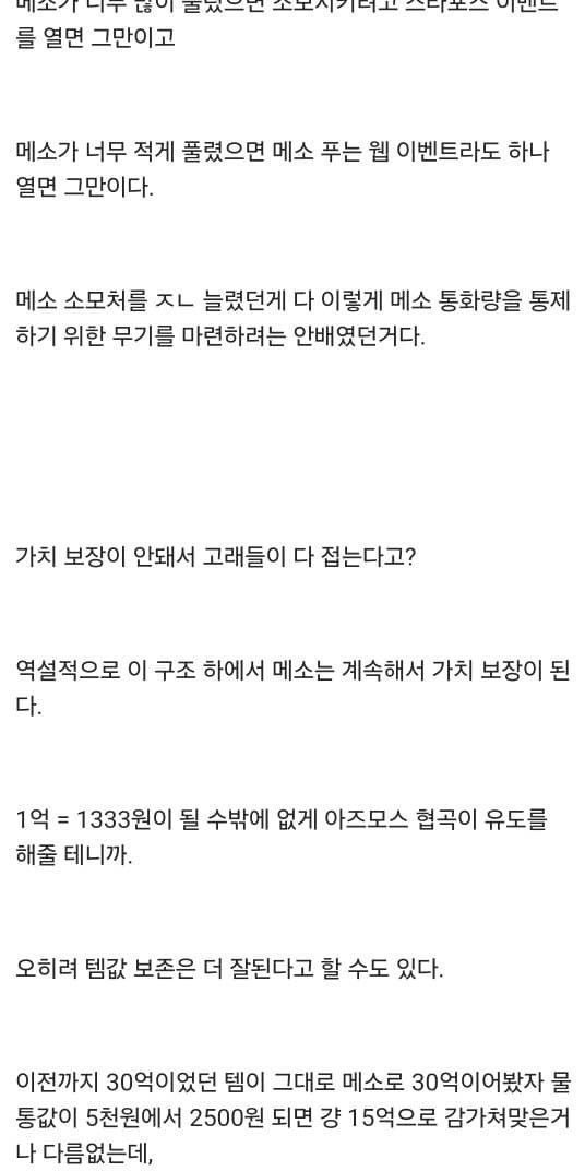 2.그런데 현금 대비 메소가치를 매우 낮게 설정한 덕분에 기존 메소 가치가 폭락해 현금거래 가격과 아이템 가격이 떨어지고 있다.